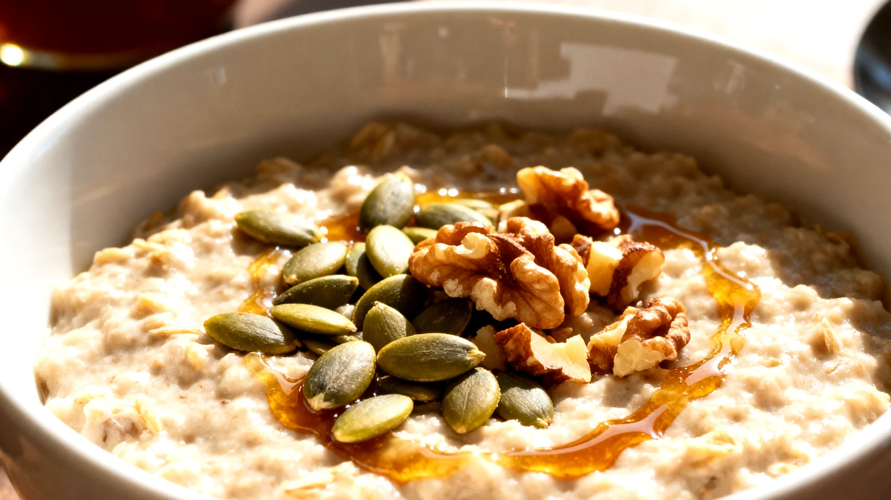 A questo punto aggiungere 15 grammi di semi di zucca e 20 grammi di noci spezzettate, completando con un cucchiaio abbondante di miele di grano saraceno. Questa sequenza garantisce che i grassi sensibili al calore mantengano le loro proprietà benefiche.